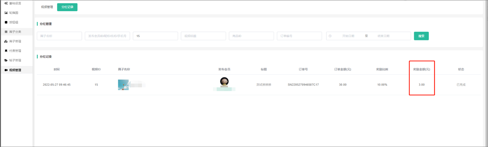 (3)购物奖励(开启选择商品按钮,上传视频发布时候选择了商品,等该视频在后台视频管理处审核通过后。会员进入前端找到该视频购买里面的商品,产生了购物奖励,奖励给发布视频者)
